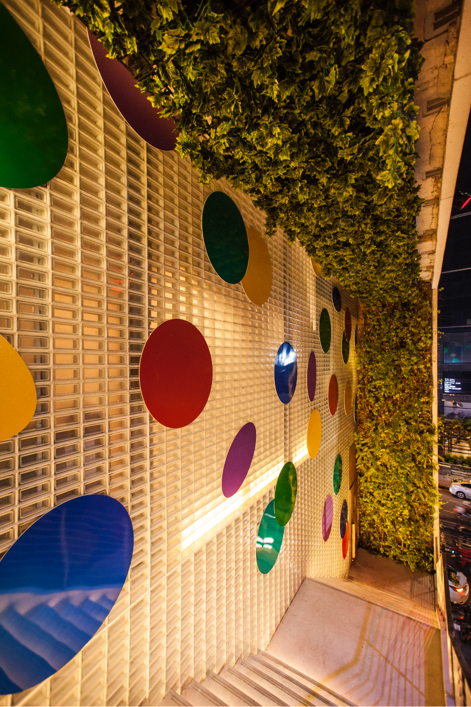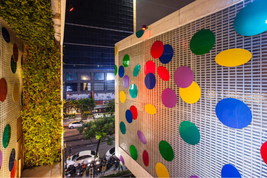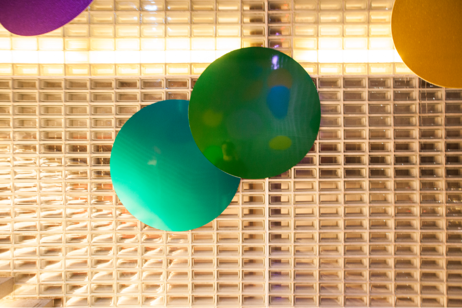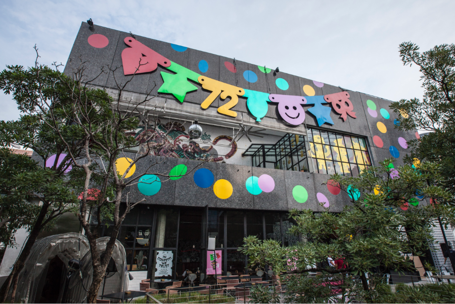 การทำงานร่วมกับทาง 72 Courtyard เขาเห็นงานดิสโก้บอลที่เราทำก็เลยชวนเรามาครีเอทงานให้กับสเปซของ72 Courtyard ซึ่งเขาอยากให้มันเป็นบรรยากาศของงานเลี้ยง และอยากให้พื้นที่ทั้งหมดเชื่อมต่อกันตลอดช่วงเทศกาลฮาโลวีน คริสต์มาส จนถึงปีใหม่ เป็นงาน Art Installation ที่ครอบคลุมพื้นที่ภายในคอร์ทยาร์ด กับบนตัวอาคารด้วยฟาซาดด้านหน้าและด้านหลัง เราเลยคิดถึงการสร้างเลเยอร์เพื่อปกคลุมทั้งตึกเอาไว้ รวมทั้งบริเวณภายในคอร์ทยาร์ดด้วย เราทำงานกับวัตถุสิ่งของไปจนถึงสัญลักษณ์ต่างๆ ในชีวิตประจำวัน เช่น ดิสโก้บอล แล้วเราก็เอามันมาทำเป็นงานดีไซน์ อย่างงาน Installation นี้ เราเอากระดาษ Confetti มาขยายให้ใหญ่ขึ้น สร้างความรู้สึกเหมือนเรื่องอลิซในดินแดนมหัศจรรย์ ที่คุณเดินอยู่ท่ามกลางชิ้นกระดาษ Confetti ขนาดยักษ์หลากสี ซึ่งให้ความรู้สึกเหนือจริง