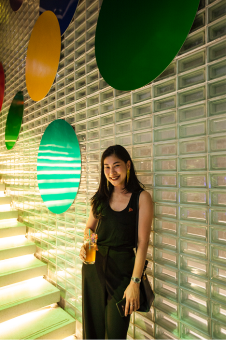 จะมีการใช้สติ๊กเกอร์ที่มีพื้นผิวลวดลายเป็นกลิตเตอร์และฟอยล์กับด้านหน้าของอาคาร ซึ่งจะต่อเนื่องไปถึงพื้นที่คอร์ทยาร์ด มีการใช้ป้ายตัวอักษร ซึ่งเราออกแบบกราฟิกของงานเองด้วยทั้งส่วนของบัตรเชิญ และอะไรต่างๆ ในงาน แต่ละโปรเจคท์ที่เราทำ เราชอบที่จะเข้าไปทำทุกอย่าง เช่น โลโก้ งานกราฟิก รวมทั้งพวกรายละเอียดยิบย่อยอย่างที่รองแก้ว ไปจนถึงถังขยะ