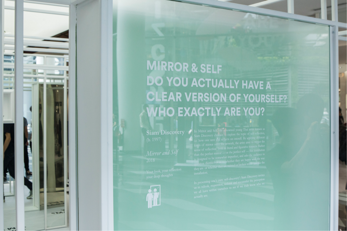 เริ่มตั้งแต่ REFLEX TO DISCOVER : MIRROR AND SELF จุดแรกบริเวณชั้น G ที่ดิสเพลย์กระจกถึง 9 แบบ ทั้งแบบมีรอยร้าว มีรูปทรงแปลกประหลาด หรือกระจกที่มีสีสัน สะท้อนความรู้สึกและตัวตนในแง่มุมที่แตกต่างกันออกไป