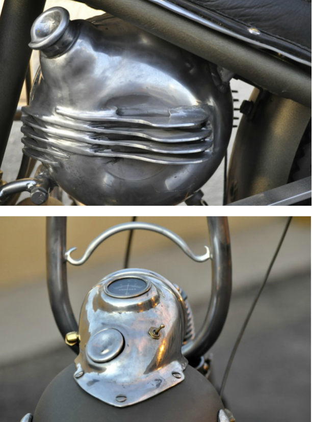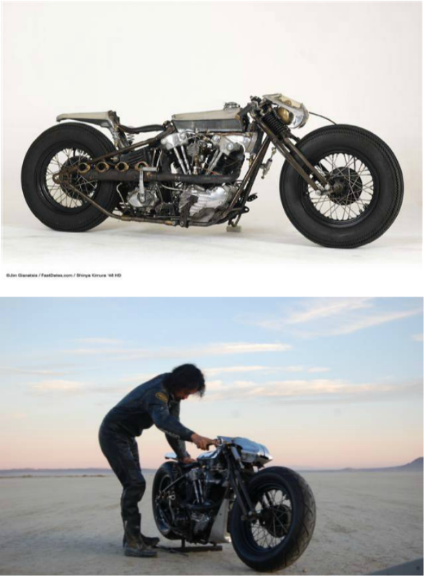 “จริงๆ แล้วผมชอบแข่งรถมากนะ” แววตาของคิมูระเริ่มมีประกายและช่างคุยมากขึ้นเมื่อเริ่มพูดคุยถึงประสบการณ์การแข่งขันของเขา ที่เคยลงแข่งมาแล้วหลายรายการไม่ว่าจะเป็น Land Speed Racing, El Mirage และ Bonneville ที่ในงานนั้นคิมูระควบ Harley-Davidson Knuckle Head ปี1946 (หรือเจ้า Spike) ลุยผ่านทะเลสาบแห้ง (Salt Flat) “ผมเริ่มทำคันนี้มาประมาณ 10 ปีแล้วครับ เริ่มจากอยากทดสอบความจุของกระบอกสูบ ว่าถ้ามันยังจุได้แค่ 1200cc เหมือนเดิม แล้วจะออกตัวได้แค่ไหนกัน ก่อนทำผมก็คิดว่ามันจะง่าย แต่พอทำเข้าจริงๆ มันยากเอาการจนไม่สามารถหยุดทำได้ แต่นั่นก็เป็นสิ่งที่ทำให้ผมได้เรียนรู้ว่า ไม่สามารถละเลยความสามารถในการเป็นช่างยนต์ได้เลยครับ”