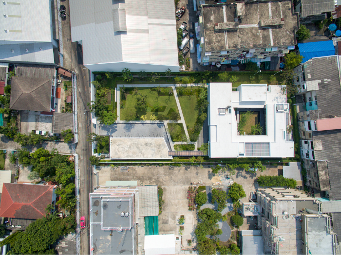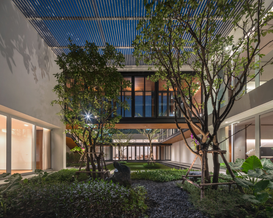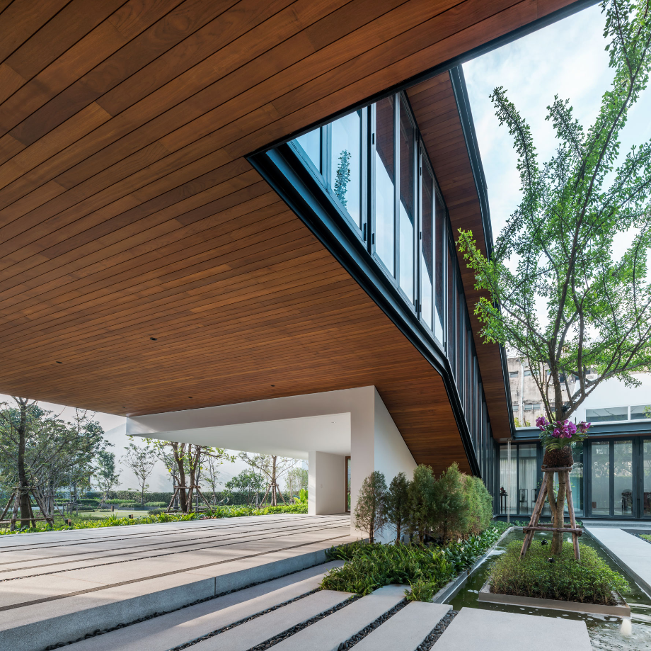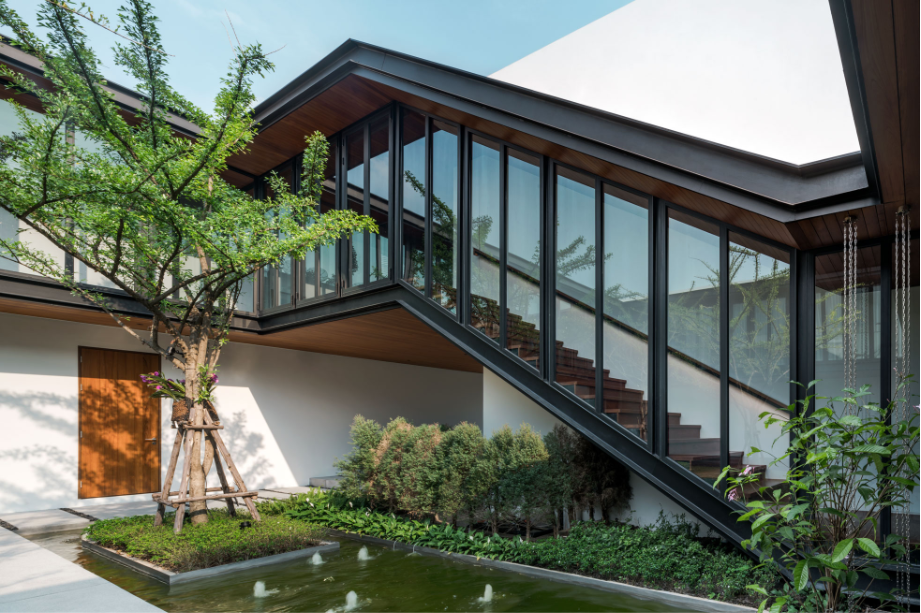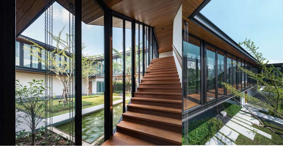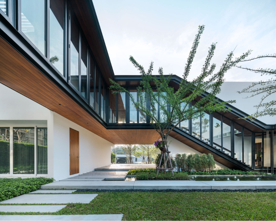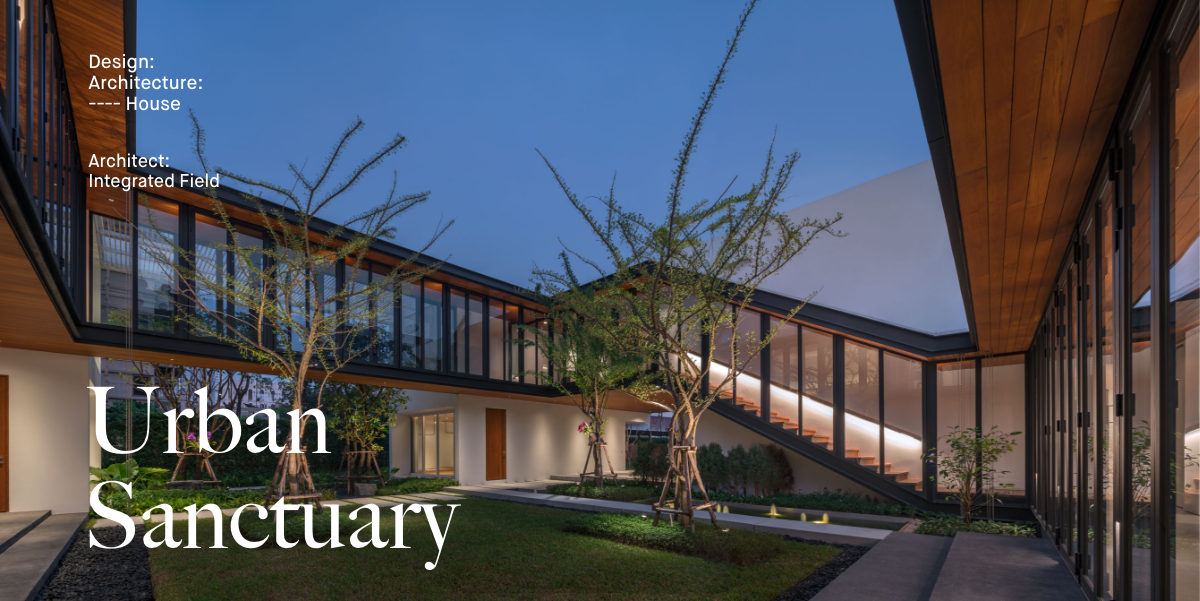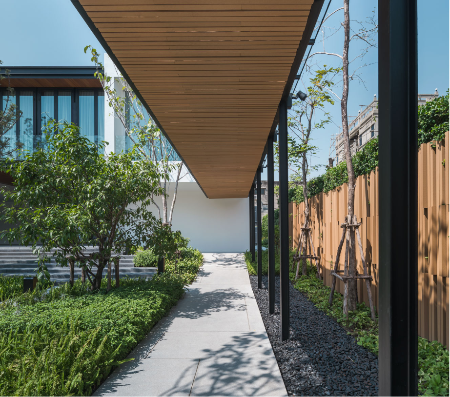 เพื่อสร้างบ้านที่เปิดโล่ง มีบรรยากาศสงบและสามารถชื่นชมสวนได้อย่างเต็มที่ บนทำเลท่ามกลางสายตาของเพื่อนบ้านนับร้อยจากอาคารพักอาศัยขนาดสูงที่ขนาบอยู่ด้านข้าง ทีมสถาปนิกจาก Integrated Field (IF) จึงต้องใช้ทั้งการวางผัง การจัดสวน และตัวอาคาร มาเป็นเครื่องมือการแก้โจทย์งานออกแบบให้ลงตัวมากที่สุด โดยวางพื้นที่ซึ่งไม่ต้องการช่องเปิดมากไว้ด้านนอกสุด ทำให้บ้านเหมือนมีกำแพงขนาดใหญ่คอยกำบังสายตาคนภายนอก จากนั้นจึงสร้างพื้นที่เปิดโล่งเป็นสวนตั้งอยู่ใจกลางบ้านช่วยสร้างบรรยากาศที่ปลอดโปร่งโดยคงไว้ซึ่งความเป็นส่วนตัวของผู้ที่อยู่อาศัยภายใน
