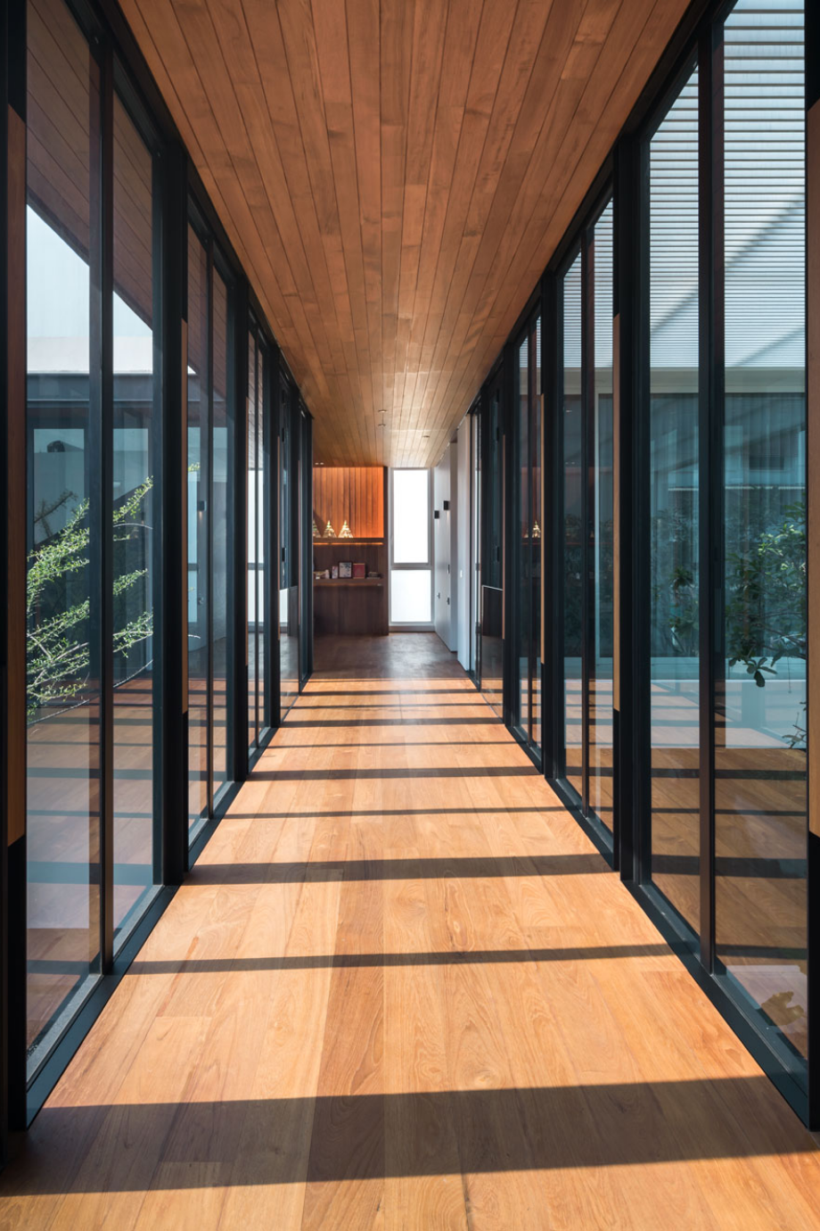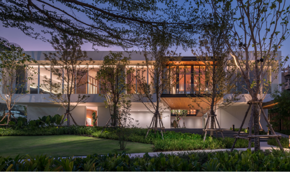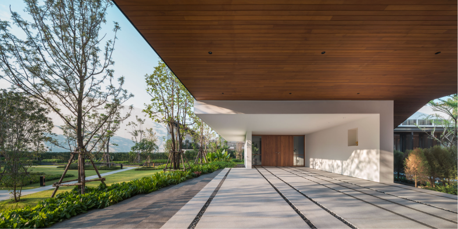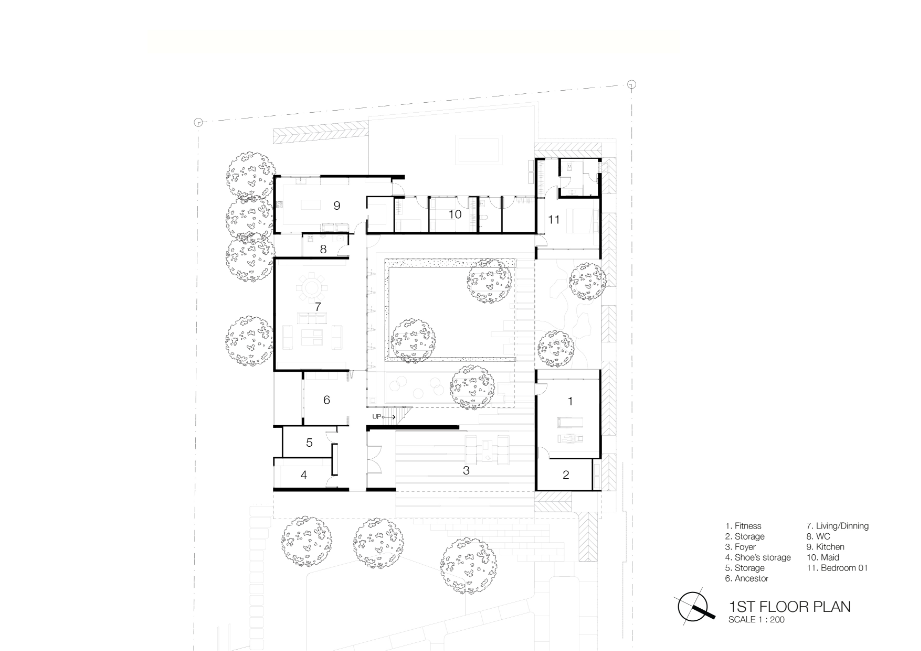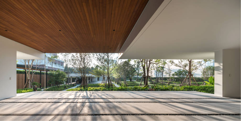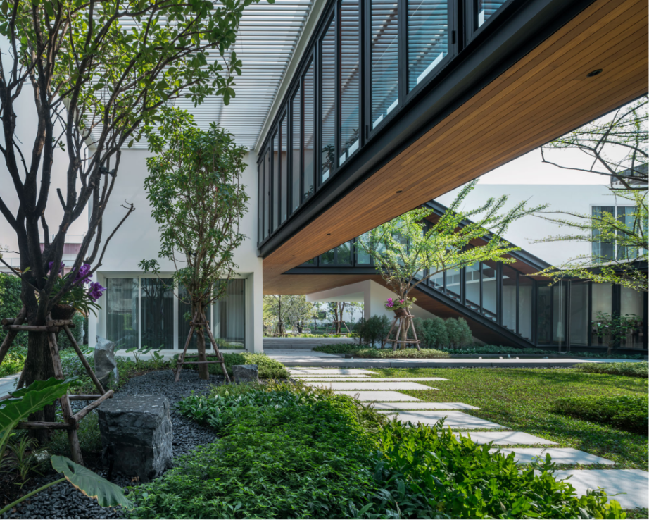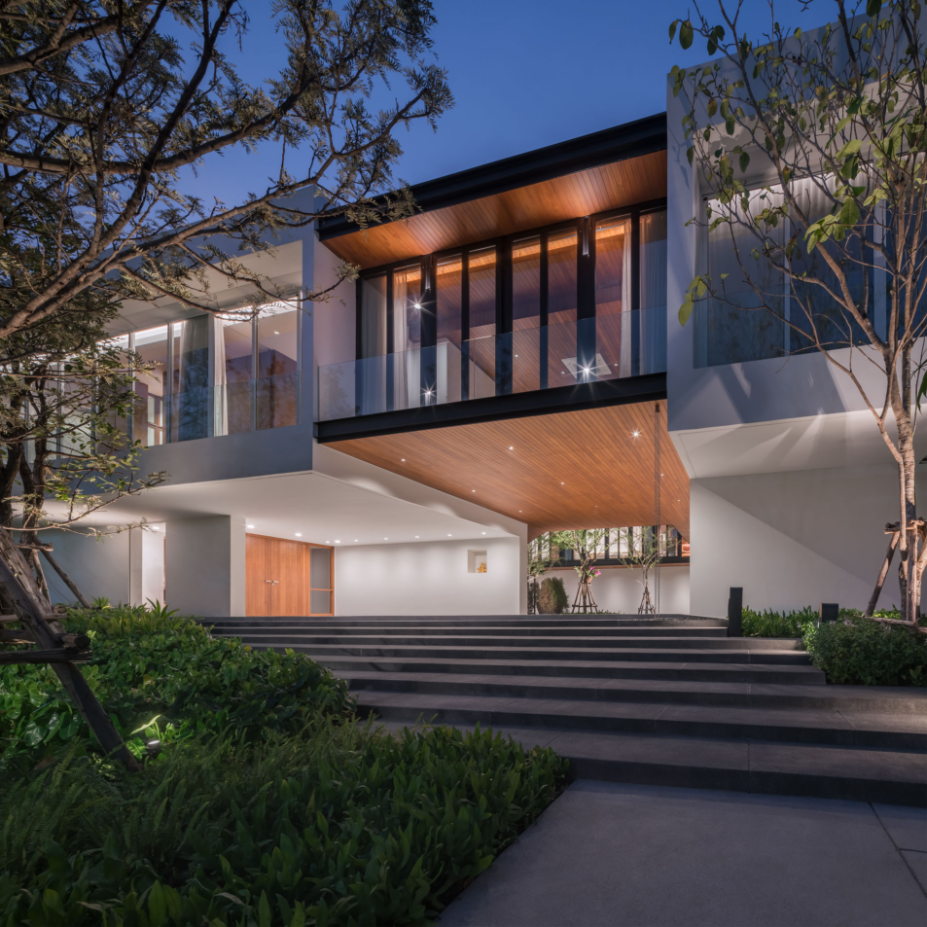 เพื่อสร้างบ้านที่เปิดโล่ง มีบรรยากาศสงบและสามารถชื่นชมสวนได้อย่างเต็มที่ บนทำเลท่ามกลางสายตาของเพื่อนบ้านนับร้อยจากอาคารพักอาศัยขนาดสูงที่ขนาบอยู่ด้านข้าง ทีมสถาปนิกจาก Integrated Field (IF) จึงต้องใช้ทั้งการวางผัง การจัดสวน และตัวอาคาร มาเป็นเครื่องมือการแก้โจทย์งานออกแบบให้ลงตัวมากที่สุด โดยวางพื้นที่ซึ่งไม่ต้องการช่องเปิดมากไว้ด้านนอกสุด ทำให้บ้านเหมือนมีกำแพงขนาดใหญ่คอยกำบังสายตาคนภายนอก จากนั้นจึงสร้างพื้นที่เปิดโล่งเป็นสวนตั้งอยู่ใจกลางบ้านช่วยสร้างบรรยากาศที่ปลอดโปร่งโดยคงไว้ซึ่งความเป็นส่วนตัวของผู้ที่อยู่อาศัยภายใน