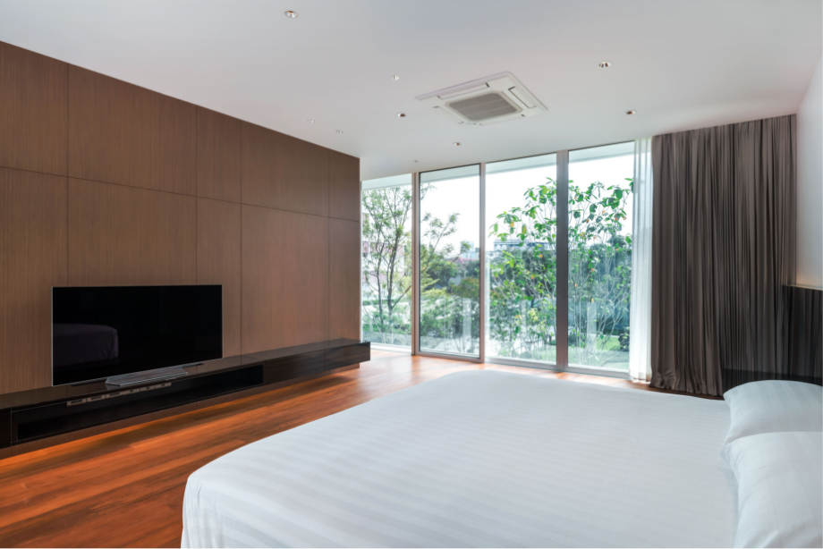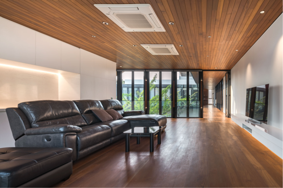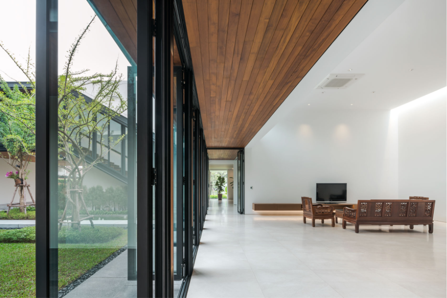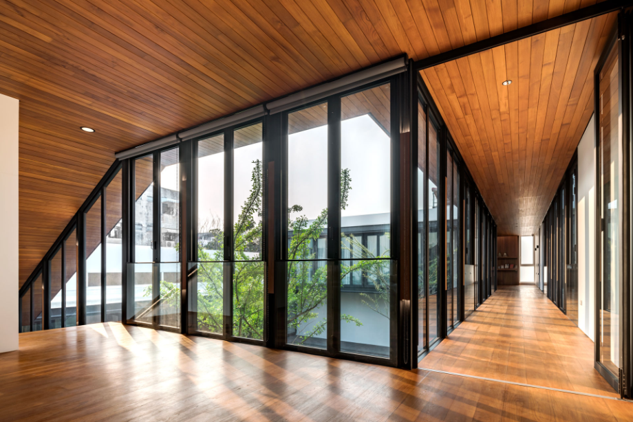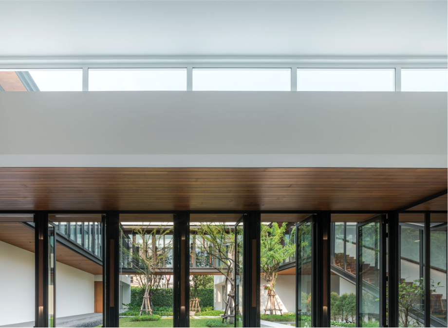 เมื่อสามารถสร้างความเป็นส่วนตัวจากพื้นที่รอบนอกได้แล้ว การใช้โครงสร้างเหล็กและหน้าต่างบานเฟี้ยม ทำให้อาคารดูโปร่ง และเปิดโล่งรับแสงธรรมชาติและลมได้อย่างเต็มที่ ในขณะเดียวกัน ไอความร้อนก็จะผ่านการกรองจากร่มไม้และกระจก Insulated Glass ก่อนที่จะเข้าไปในตัวบ้าน นอกจากนั้น ยังมีการใช้ช่องแสงจากหลังคา Sky Light ที่สามารถรับแสงสว่างโดยที่กันสายตาจากคนภายนอกได้อย่างมีประสิทธิภาพอีกด้วย