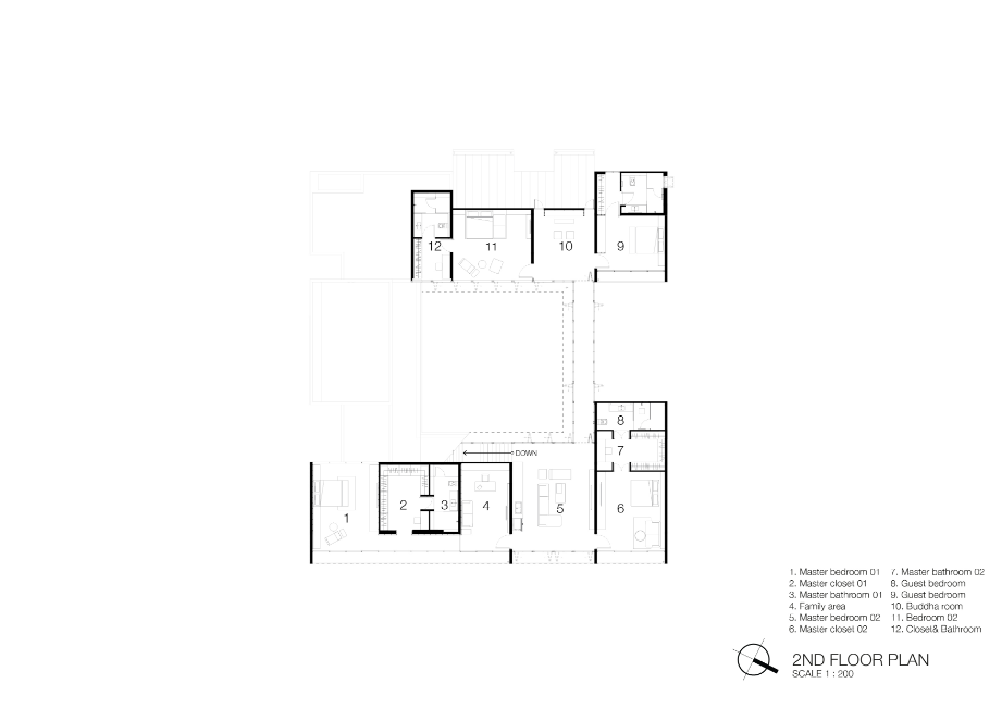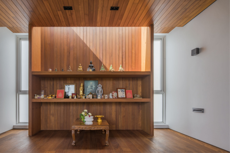 เนื่องจากสมาชิกในบ้านมีทั้งพ่อแม่ซึ่งอยู่ในวัยก่อนเกษียณ กับลูกๆ ซึ่งกำลังสร้างครอบครัวใหม่อยู่ใต้ชายคาเดียวกัน การออกแบบพื้นที่ส่วนกลางให้สมาชิกในครอบครัวทุกคนได้มีพบปะพูดคุยกันจึงเป็นหัวใจสำคัญของบ้านที่จะขาดไม่ได้ การจัดวางพื้นที่ส่วนกลางต่างๆ ทั้งห้องนั่งเล่น ห้องอาหาร ห้องพระ และห้องบรรพบุรุษ พร้อมทั้งทางสัญจรให้ล้อมรอบสวนอีกชั้นหนึ่ง ทำให้สมาชิกในครอบครัวได้มีโอกาสพบปะพูดคุยกันท่ามกลางบรรยากาศของสวนกลางบ้านที่ร่มรื่น